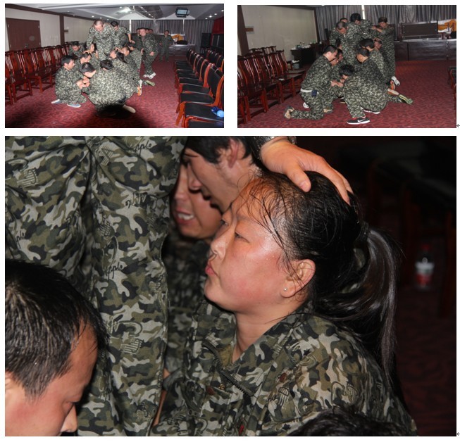没有一个要求退出,更可敬的是我们的两位女“桥墩”们,平时是那么爱惜自个的纤纤玉手,但今天却要让40多位同事们挨个踩踏过去,当时大家都为她们担心,刚开始时大家因不熟悉和不忍心踩踏同事娇嫩的手而履履犯规,导致前几次都过去好多人了,又在教练严厉的喝斥声中返回重新开始。在场的所有队员们情不自禁的失声痛哭,泪水从每个通过的队友脸上滑落在底下“桥墩们”的脸上、身上、还有被踩踏的变得通红的手臂上,与每位“桥墩们”身上流的汗水混成一块,凝聚在一起,分不出到底是泪还是汗。其间我们的队友差点掉下去,但还是被“桥墩”们死死的扛起,此情此景,不论是女队员,还是坚强的爷们,都感动的眼圈泛红,强压的泪水不经意间流了下来,在此时,我们彼此忘记了曾经之间的争吵,矛盾,还有利益,相信此时的感情流露是真诚的,刻骨铭心的,在此时,每个人都忘记了自个的尊微,放下心中所有积怨,坦诚面对一起曾同甘共苦,患难与共,朝夕相处的队友们。