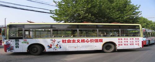 8月29日以来,公司再次先后在中山路、姜谭路、宝光路、滨河大道、火炬路、行政中心、东风路、经二路、群众路、新福路、宝平路、清姜路等市区主要路段沿线候车亭灯箱、站牌上,制作、发布了以社会主义核心价值观、“图说我们的价值观”为主要内容的公益广告120多幅,在39路制作全车体广告1辆,丰富了“创文”公益广告发布,传播了正能量。