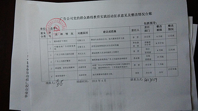 近期,公司按照党的群众路线教育实践活动要求,采取走访、座谈交流、发放征求意见表等形式,广泛征求职工对领导班子、领导干部和党员在作风方面存在的突出问题。同时,结合实际工作,听取职工群众和客户对广告经营、企业发展、客户服务等方面的意见和建议,详细了解职工和客户关心关注的热点难点问题或影响制约单位发展的问题。围绕服务基层一线、改进作风、提升效益、促进发展开门纳谏,听民声,解民忧,促进企业健康、快速发展。