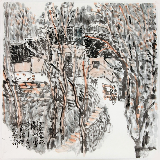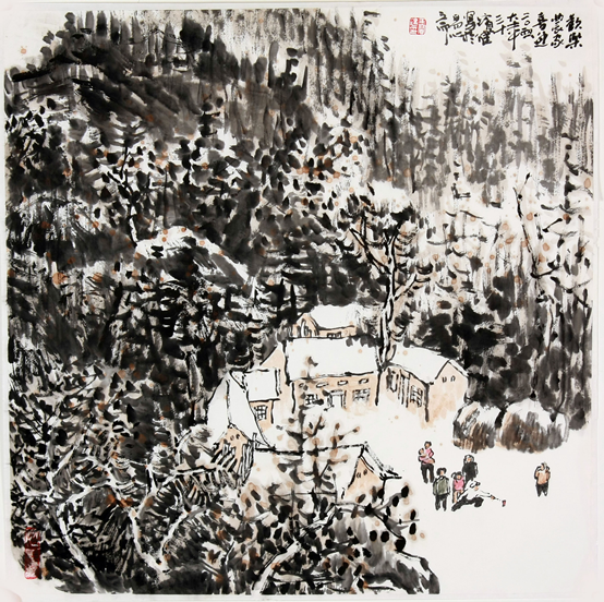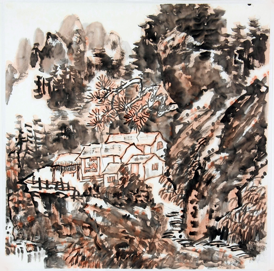 他的作品是入世的,在大山激流中,你看不到对尘世的远离,能感受到人的足迹,画面或两三人,或一两间房屋。简单平常的景色,使作品更接地气,让你感到亲切,有一股生命的暖意。他的作品并没有过多的技法,更没有华丽的语言,更多的是对生活直愣愣的写照,这反而使作品多了一份率真。