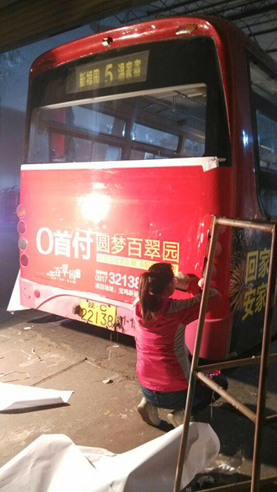 3月20日晚上,随着公交车进入车间,制作部开始了对公交车身广告的制作,制作部李建辉、支月林、冯阳、赵燕妮在副主任李德虎的带领下,开始了对1路露露和5路百翠园两台车身广告的制作。大家分工协作,李建辉、李德虎负责车的左右侧面,赵燕妮负责车头、车尾,冯阳负责车顶,各司其职。夜晚虽然天气寒冷,但是员工们却带着饱满的热情工作着,每个人个个刀工精细,对刮板的使用也是得心应手,用娴熟的技巧粘贴着广告,用极高的效率及早完成了此次制作任务。
