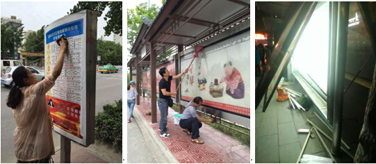 针对辖区点多、线长、面广的现状,广告公司划分片区责任到组、落实到人,对全市400余座候车亭及站牌进行了全面清洁。全体员工顶着炎炎烈日,逐站保洁,铲除野广告,清洗候车亭,不放过任何一个死角,晚上对全市候车亭灯箱维修亮化,使全市公交站牌面貌焕然一新。