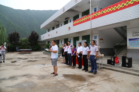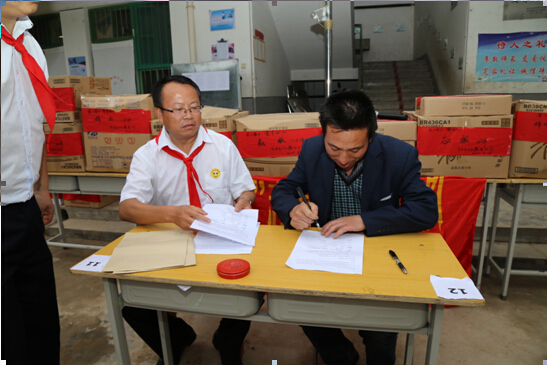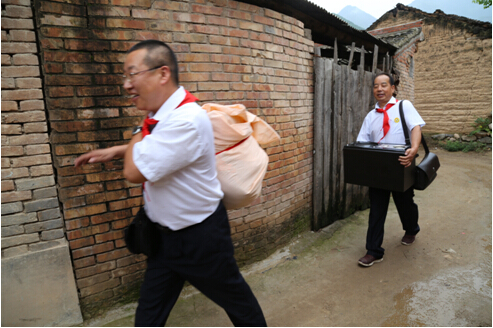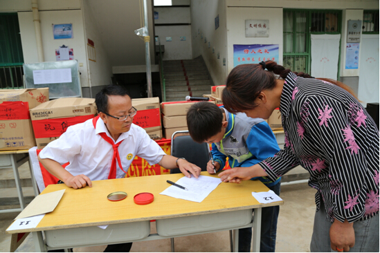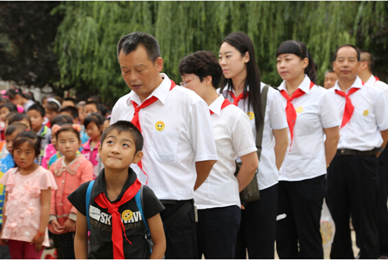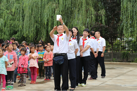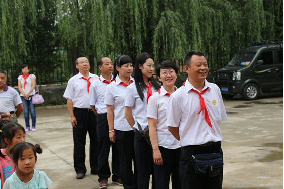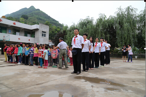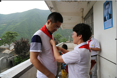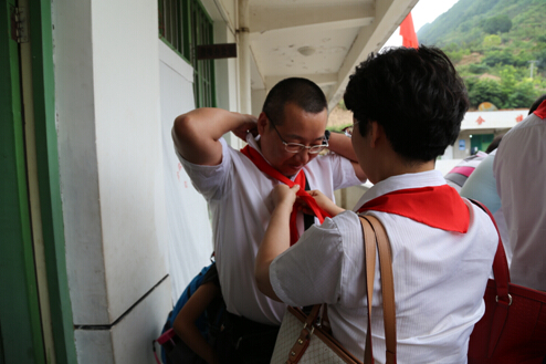 雨后的乡间小路一路泥泞,经过将近3个小时的长途跋涉,我们最终抵达目的地——凤阁岭镇孙家村小学。我们重温昔日的红领巾,佩戴走起,瞧,大家多认真: