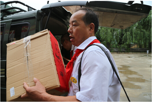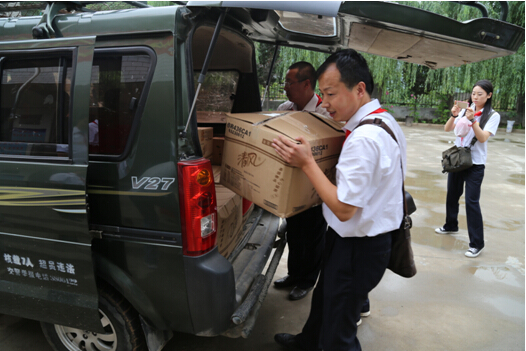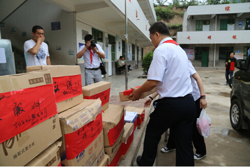 由于进入校园道路比较狭窄,我们部分物品无法直接开车拉到校园,虽然一路劳累,大家鼓起劲,将爱心物品搬到学校。