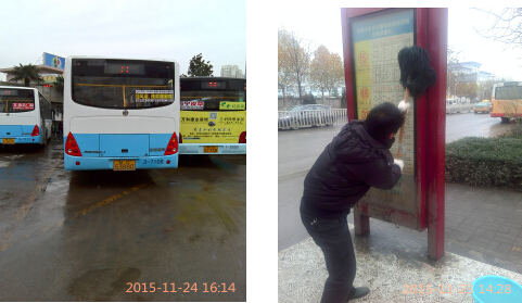 【本站快讯】2015年11月18日,制作二部全体成员在统一安排下,对71路后风挡上城际酒店和K15路后风挡上的海宁皮草进行不留痕迹地清除,同时,对辖区的候车设施,进行了保洁。保洁活动中,我部门全体成员自上而下始终保持着饱满的工作热情,积极努力完成自己在本职岗位工作的基础上,进一步努力把目标定的更高更远。