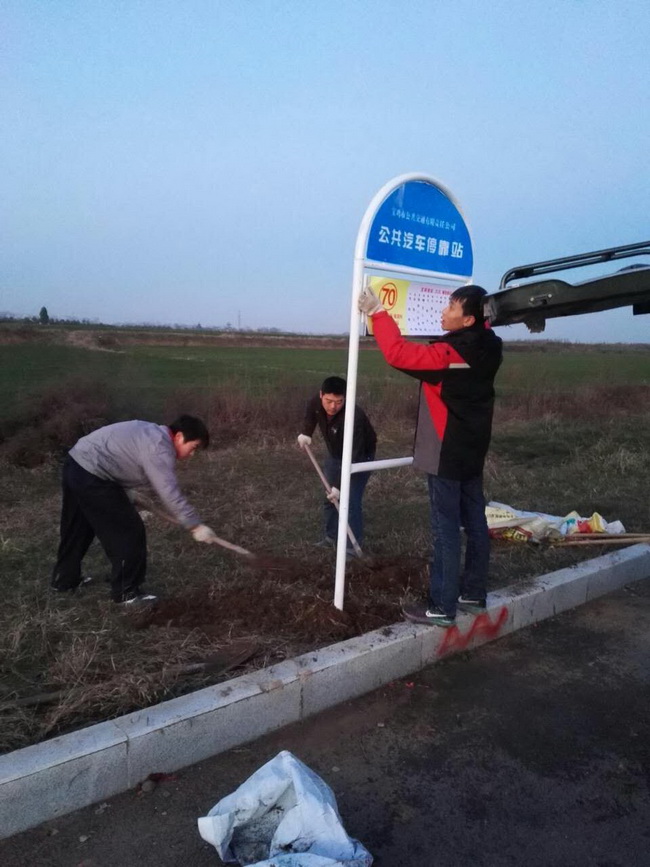 从早晨8时起二部将安装站牌所需的发电机,洋镐,铁锹,站杆等设备准备好后,便向潘龙路进发。在安装过程中,遇栽杆地点没有摆放的基石,我们就从附近的沟坎进行寻找;遇特别坚硬的地面十分难挖,我们又用手动工具凿开。工人们不怕脏不怕累,圆满完成16副站牌的安装。