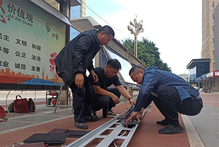 为确保媒体的正常营运,顺利发布各项公益及商业广告,采编部的工作人员们顶着烈日,冒着酷暑,一直坚守岗位,忙碌着进行维保工作。从6月初至今,采编部集中排查清姜路,蟠龙路,渭滨大道,站前大道等公交主干道,维修点位31处,电子站牌7处,站箱23个,灯箱61个,候车亭LED屏54个,对新建候车亭及移栽候车亭进行电路整改调试,LED屏上传字幕。有效地保证了公交电子媒体的正常运营。
